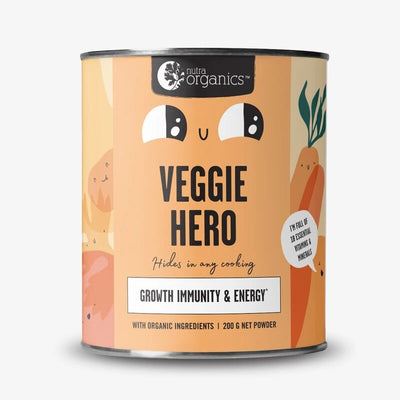 Containing 18 bio available vitamins & minerals from pure, organic wholefoods, including Vitamins A, C, D, E, B Vitamins, Zinc, Folate & Iodine, Veggie Hero supports immunity, growth and energy.